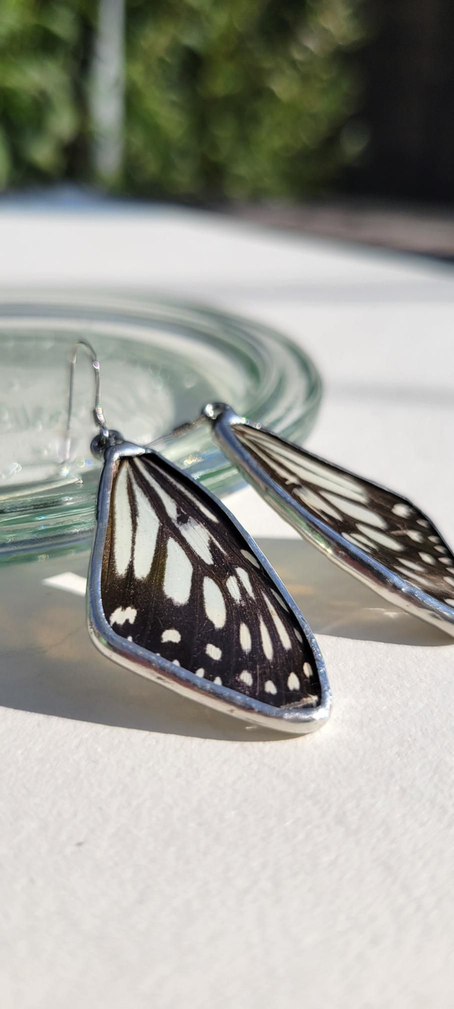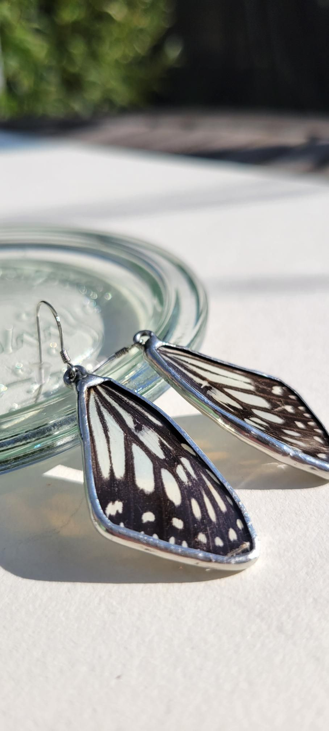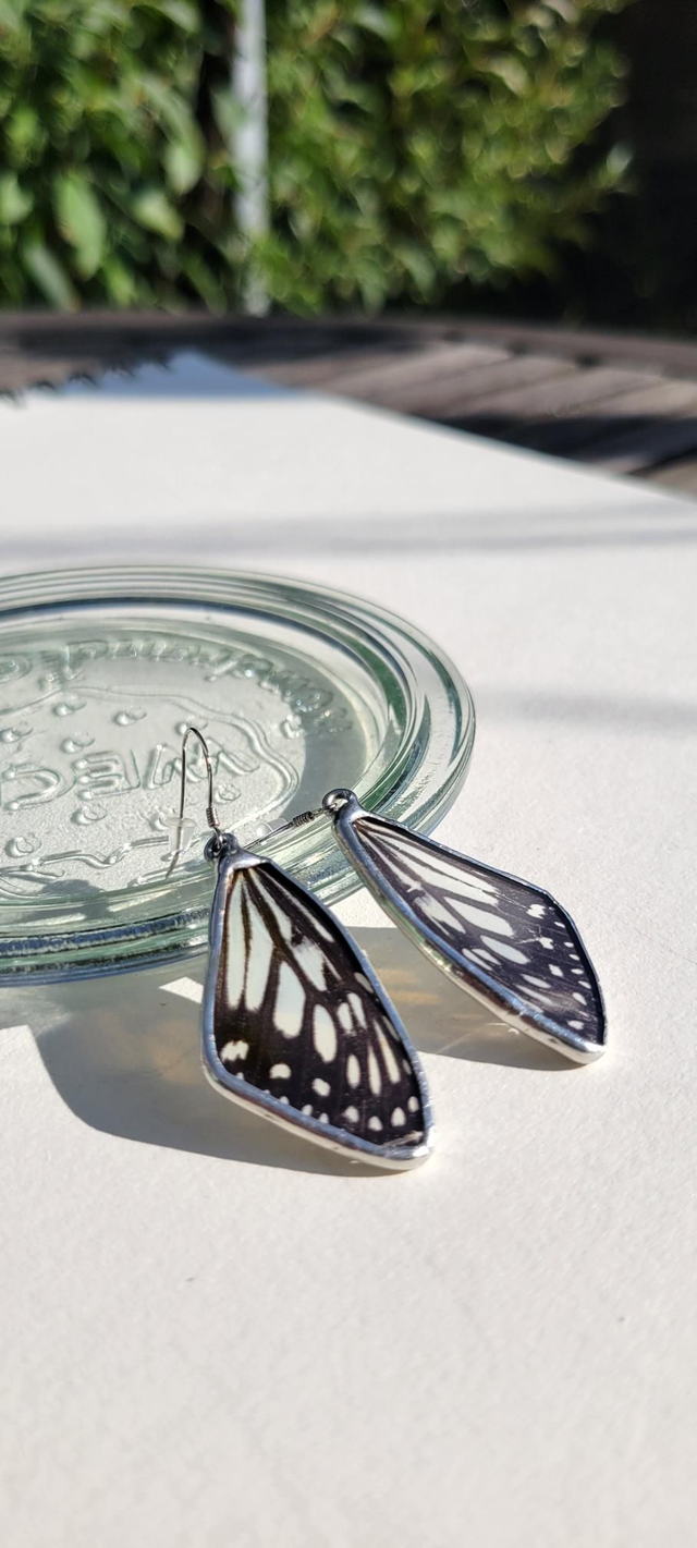 Boucles d'oreilles uniques réalisées avec de véritables ailes de papillon. Chaque aile de papillon est serti entre deux plaques de verre. Le verre utilisé est extrêmement fin, l'épaisseur de la boucle est de 2 millimètres, ce qui lui confère beaucoup de légèreté. Le sertissage est réalisé à l'étain de bijouterie (sans plomb). Les boucles sont montées sur des crochets en argent 925 et fournies avec des embouts en silicone pour prévenir les chutes.