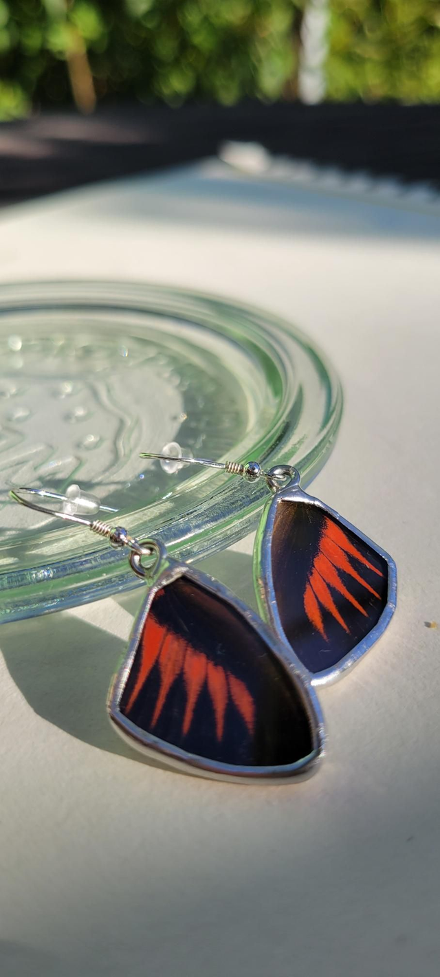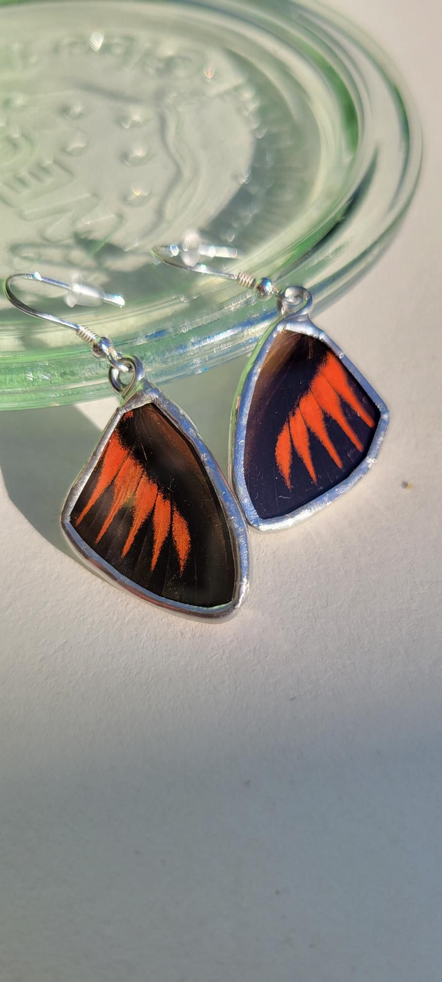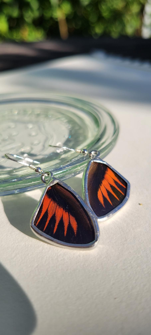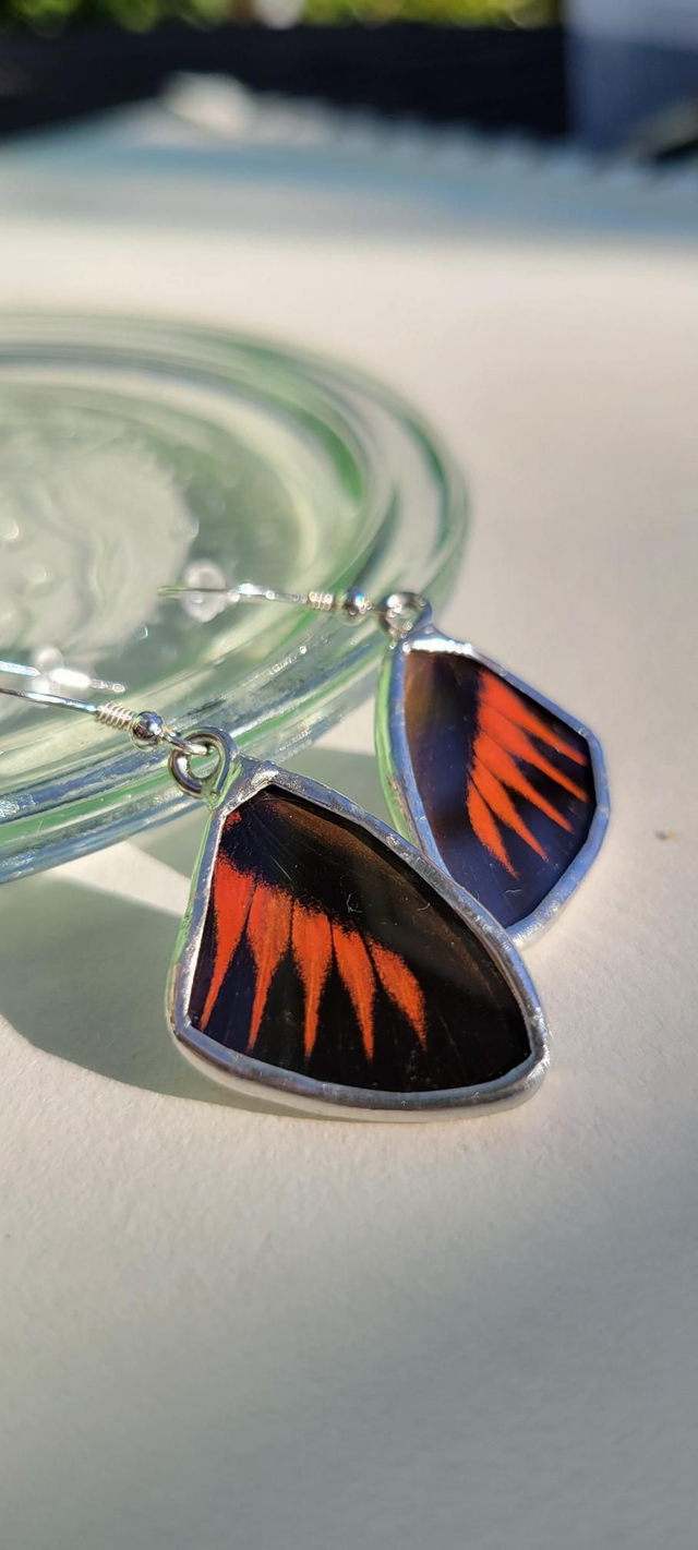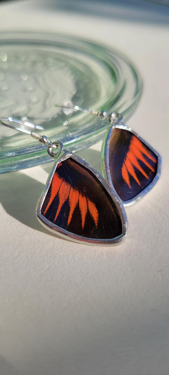 Boucles d'oreilles uniques réalisées avec de véritables ailes de papillon. Chaque aile de papillon est serti entre deux plaques de verre. Le verre utilisé est extrêmement fin, l'épaisseur de la boucle est de 2 millimètres, ce qui lui confère beaucoup de légèreté. Le sertissage est réalisé à l'étain de bijouterie (sans plomb). Les boucles sont montées sur des crochets en argent 925 et fournies avec des embouts en silicone pour prévenir les chutes.