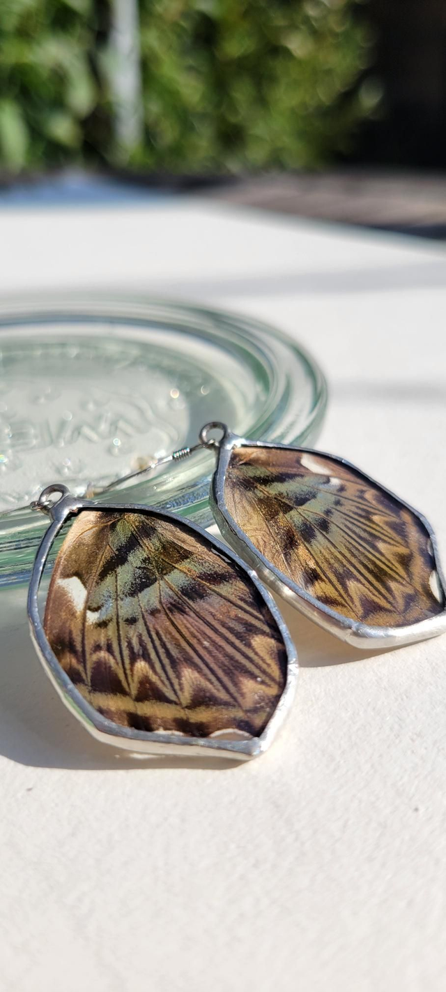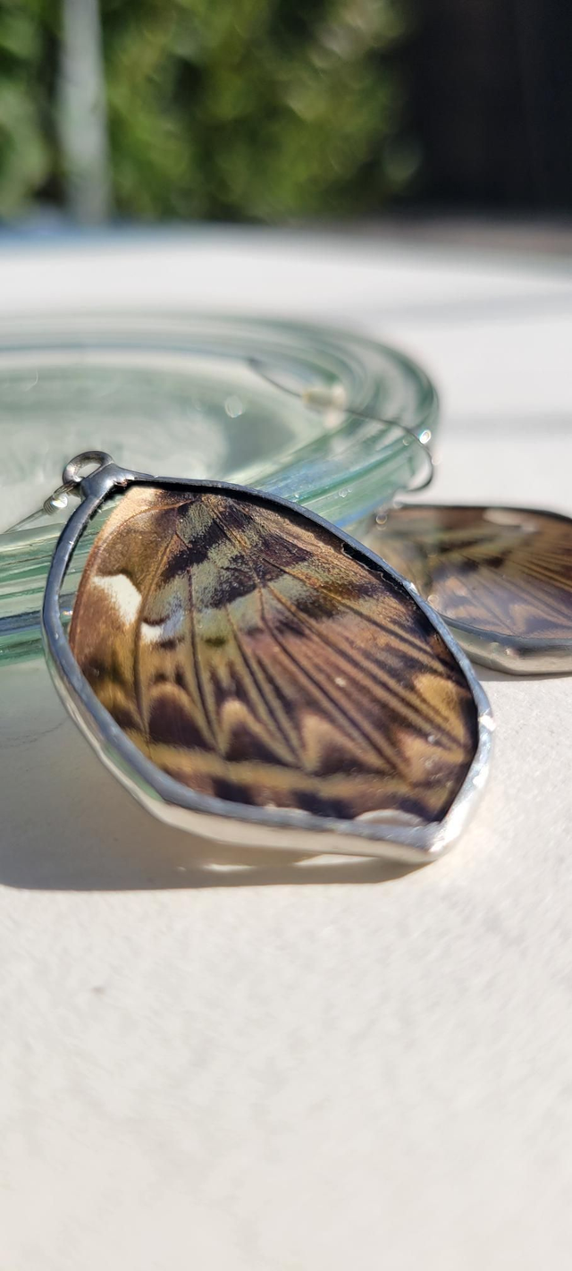 Boucles d'oreilles uniques réalisées avec de véritables ailes de papillon. Chaque aile de papillon est serti entre deux plaques de verre. Le verre utilisé est extrêmement fin, l'épaisseur de la boucle est de 2 millimètres, ce qui lui confère beaucoup de légèreté. Le sertissage est réalisé à l'étain de bijouterie (sans plomb). Les boucles sont montées sur des crochets en argent 925 et fournies avec des embouts en silicone pour prévenir les chutes.