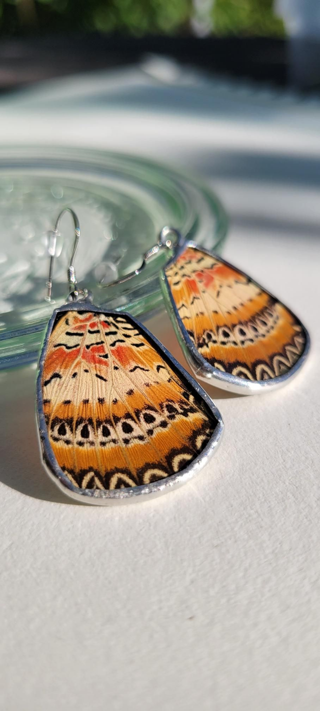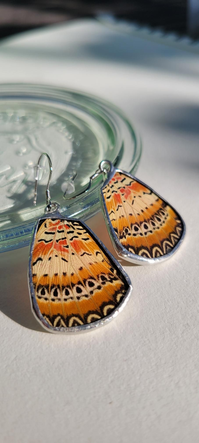 Boucles d'oreilles uniques réalisées avec de véritables ailes de papillon. Chaque aile de papillon est serti entre deux plaques de verre. Le verre utilisé est extrêmement fin, l'épaisseur de la boucle est de 2 millimètres, ce qui lui confère beaucoup de légèreté. Le sertissage est réalisé à l'étain de bijouterie (sans plomb). Les boucles sont montées sur des crochets en argent 925 et fournies avec des embouts en silicone pour prévenir les chutes.